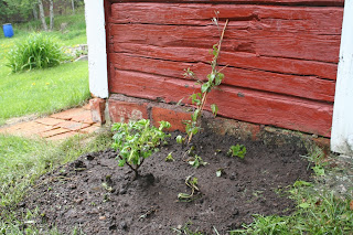 Istutin ruusupensaan samaan syvyyteen kuin se oli purkissa ja kärhön kymmenisen senttä syvempään. Aion vielä askarrella kanaverkkoa tuohon seinälle, jotta kärhö voi kiipeillä sitä pitkin.